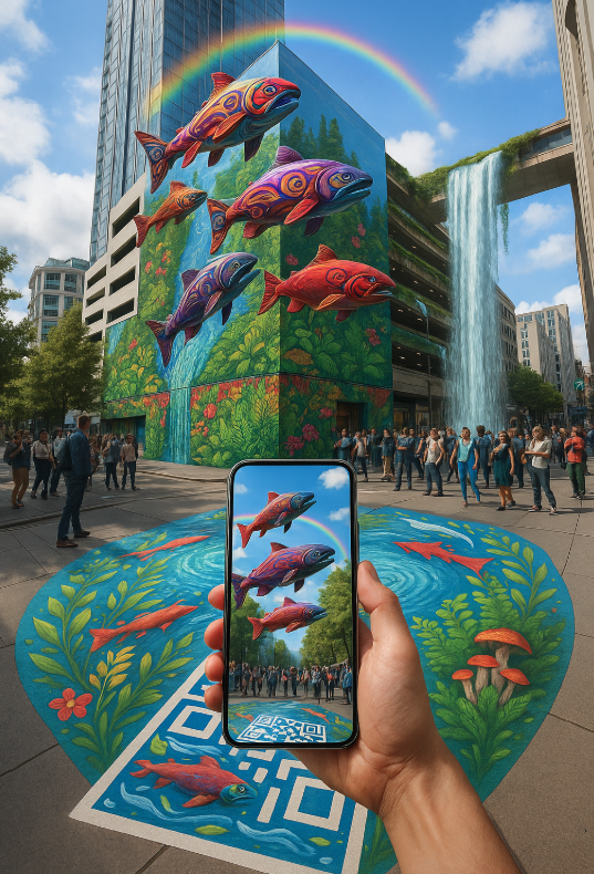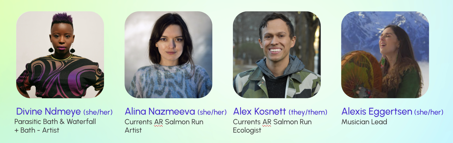Inspired by previously created Future Arts projects and local community research, like Divine Ndemeye’s Parasitic Healing Bath (2023) and Alina Nazmeeva’s Currents AR salmon run (2022, 2024), this installation builds on Ndemeye’s plant-based ethnobotanical designs and symbologies stewarded with local Indigenous ethnobotanist and artist Bri Castilleja with salmon migration visuals by Alina Nazmeeva and Alex Kosnett. In this iteration, workshops with local Indigenous stewards and additional communities will be held to continue building an entire new world rooted in history. Together with soundscapes led by local musician Alexis Eggertsen, OTHER EARTH becomes a portal of healing, celebration, and ecological reconnection to ancestry and Indigeneity of any passerby—while grounding in the local waterways and buried ethnobotanical histories beneath downtown Seattle.