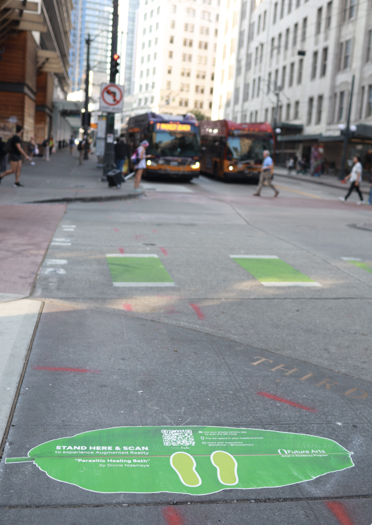 Inspired by previously created Future Arts projects and local community research, like Divine Ndemeye’s Parasitic Healing Bath (2023) and Alina Nazmeeva’s Currents AR salmon run (2022, 2024), this installation builds on Ndemeye’s plant-based ethnobotanical designs and symbologies stewarded with local Coast Salish ethnobotanist and artist Bri Castilleja with salmon migration visuals by Alina Nazmeeva and Alex Kosnett. In this iteration, gatherings with local Coast Salish stewards and additional communities historically “othered” will be held to continue building an entire new world rooted in historic stories and futuristic hopes and dreams. Together with soundscapes led by local musician and multimedia artist Alexis Eggertsen, OTHER EARTH becomes a portal of healing, celebration, and ecological reconnection to ancestry and Indigeneity of any passerby, while grounding in the local waterways and buried ethnobotanical histories beneath downtown Seattle.
